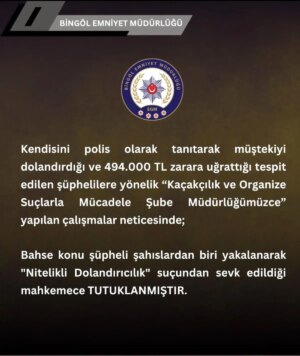 Bingöl’de kendini polis olarak tanıtan bir şahıs, bir vatandaşı 494 bin lira dolandırmaktan tutuklandı. Emniyet Müdürlüğü, şüpheliyi ‘Nitelikli Dolandırıcılık’ suçundan mahkemeye sevk etti.